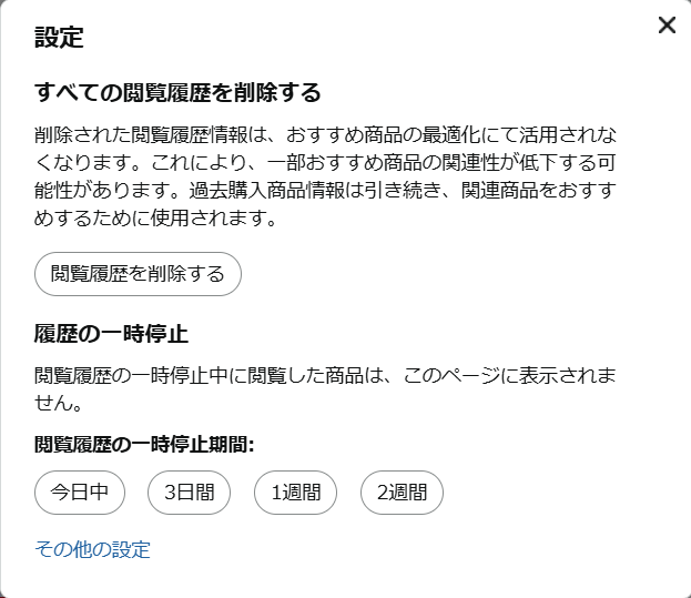 また、そのまま設定画面で閲覧履歴の一時停止や、無効化することも可能です。